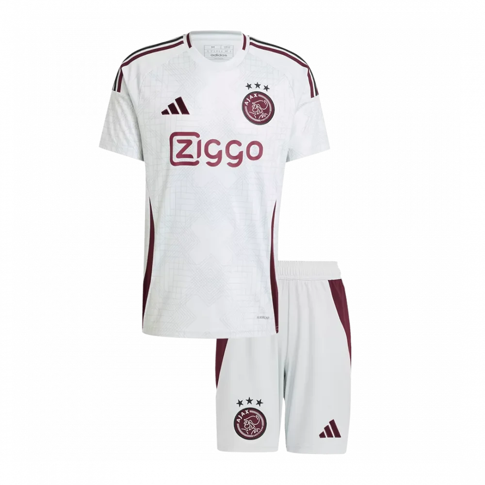 Step onto the field with the Ajax Third Away Kids Soccer Jerseys Kit, a sleek tribute to one of football’s most legendary clubs. Featuring a crisp white base with subtle geometric patterns and deep burgundy accents, this kit reflects Ajax’s rich heritage and dynamic playing style. Perfect for young fans aiming to emulate the club’s passion and precision, it combines classic design with modern performance.