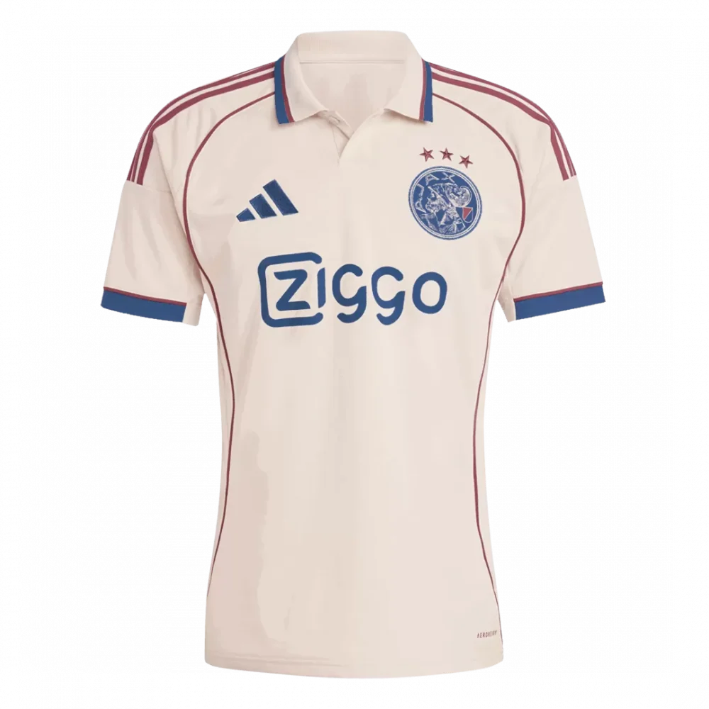 Step into the legacy of Ajax with the Third Away Soccer Jersey 2025/26, featuring a clean off-white base accented by deep red piping and navy blue highlights. This classic yet modern design honors the club’s rich history and unmistakable spirit, while the tri-star crest pays tribute to Ajax’s legendary achievements. Built for those who demand peak performance, this jersey combines breathable, lightweight fabric with advanced moisture-wicking features to keep you comfortable on and off the pitch.