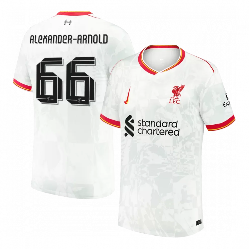 Step onto the pitch with the Liverpool Third Away Soccer Jersey, proudly representing Alexander-Arnold and his iconic number 66. This crisp white jersey features subtle tonal patterns inspired by Liverpool’s rich history, complemented by vibrant red and yellow accents that pay tribute to the club’s fiery passion and relentless spirit. Crafted with breathable, lightweight fabric and advanced moisture-wicking technology, it keeps you cool and comfortable from kick-off to the final whistle.