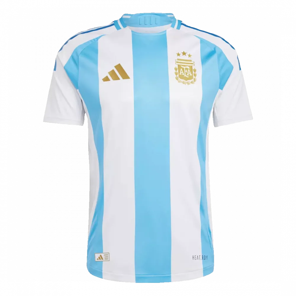 Step into the spirit of Argentine football with the Argentina Home Authentic Soccer Jersey, featuring the timeless sky blue and white vertical stripes that embody a legacy of passion and triumph. This jersey pays tribute to the nation’s rich football history, adorned with gold accents symbolizing Argentina’s prestigious victories and standing proud as a symbol of national pride.
