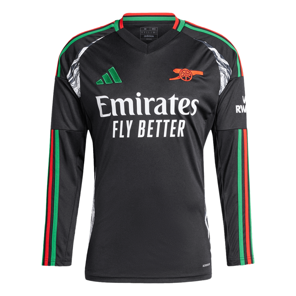 Step into Arsenal’s legacy with this striking Away Long Sleeve Jersey. Featuring a sleek black base enhanced by bold red and green stripes along the sleeves and collar, the design pays homage to the club’s rich history and vibrant spirit. The iconic cannon emblem in vivid red stands proudly on the chest, symbolizing Arsenal’s strength and resilience through the years.