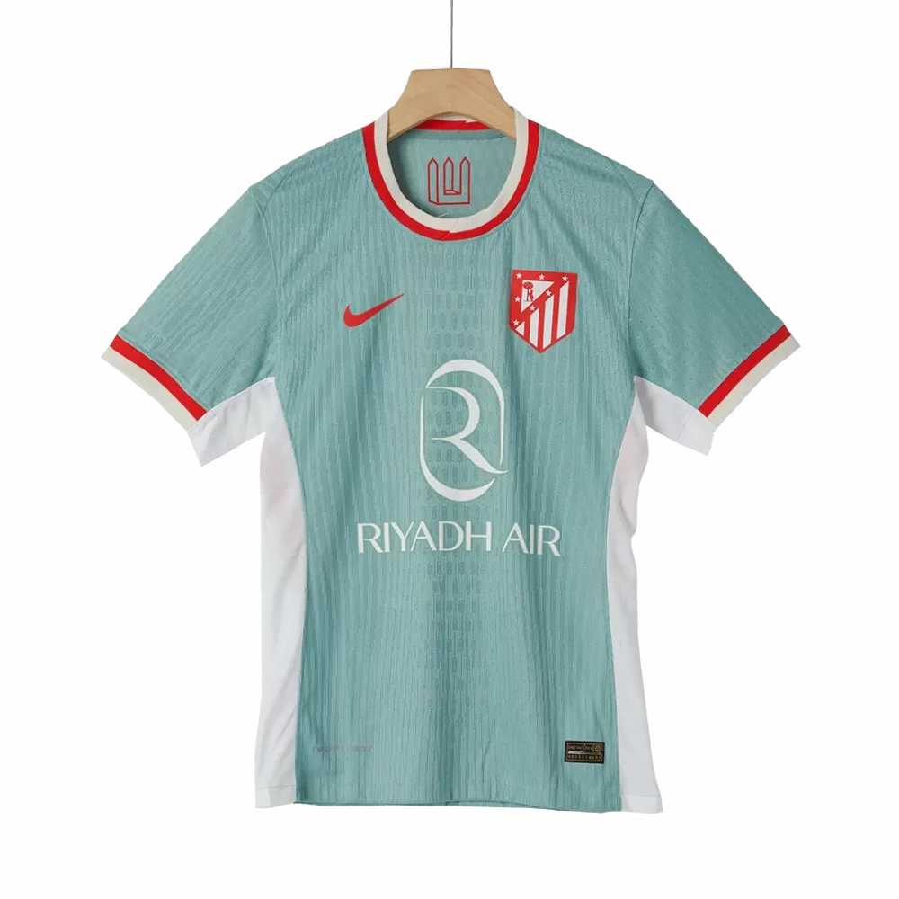 Step into the spirit of Atlético Madrid with this striking Away Player Version Jersey. Featuring a fresh light teal base accented by bold red and crisp white details, this design pays homage to the club’s relentless energy and storied passion. The subtle tonal pattern adds depth and movement, reflecting the dynamism of Los Rojiblancos on the road.