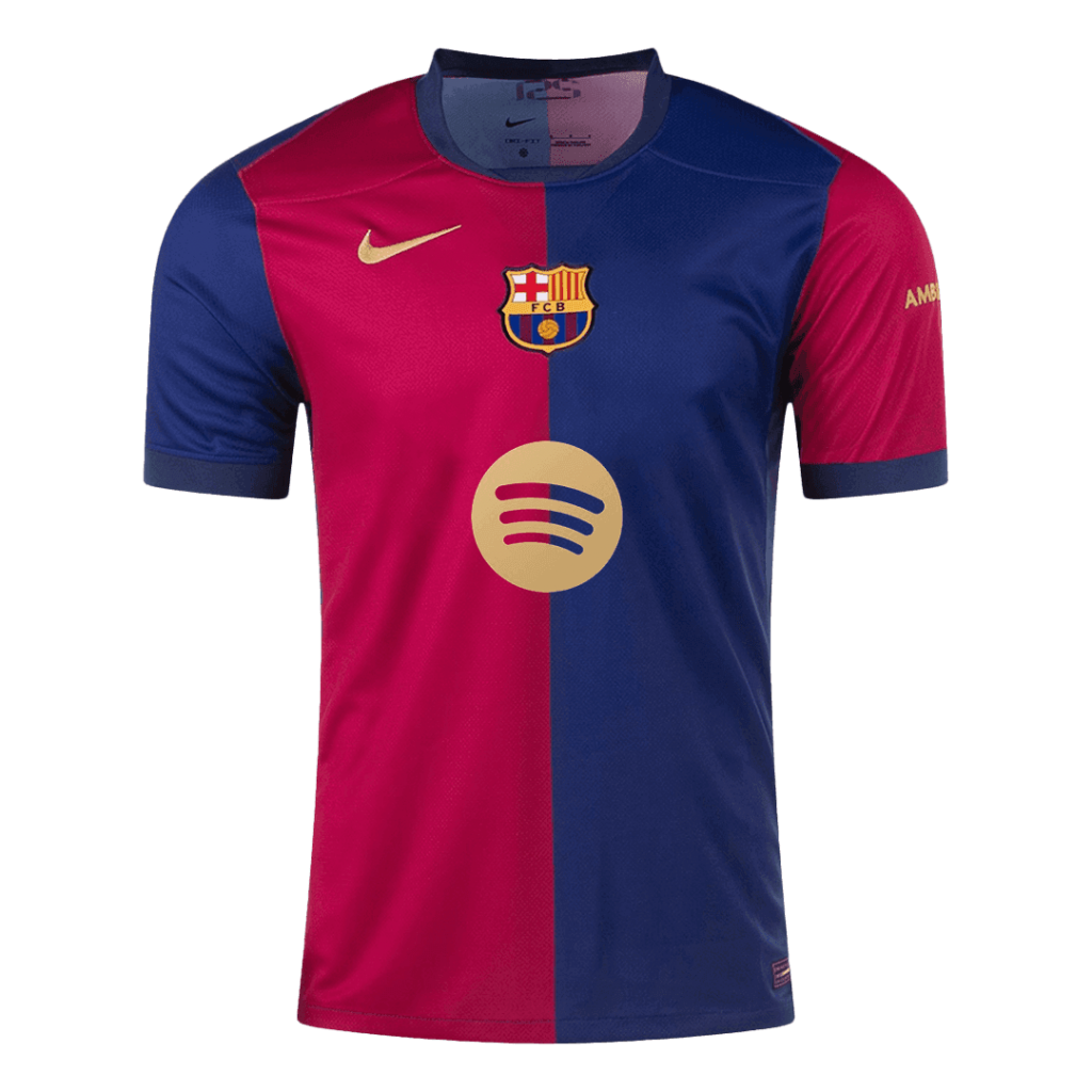 Step onto the pitch with the Barcelona Home Soccer Jersey, a bold statement of the club’s proud heritage. Featuring the iconic split design in deep red and blue, this jersey captures the spirit of Barcelona’s rich history and unwavering passion. The gold details, including the crest and sponsor logo, add a touch of elegance to this timeless classic.
