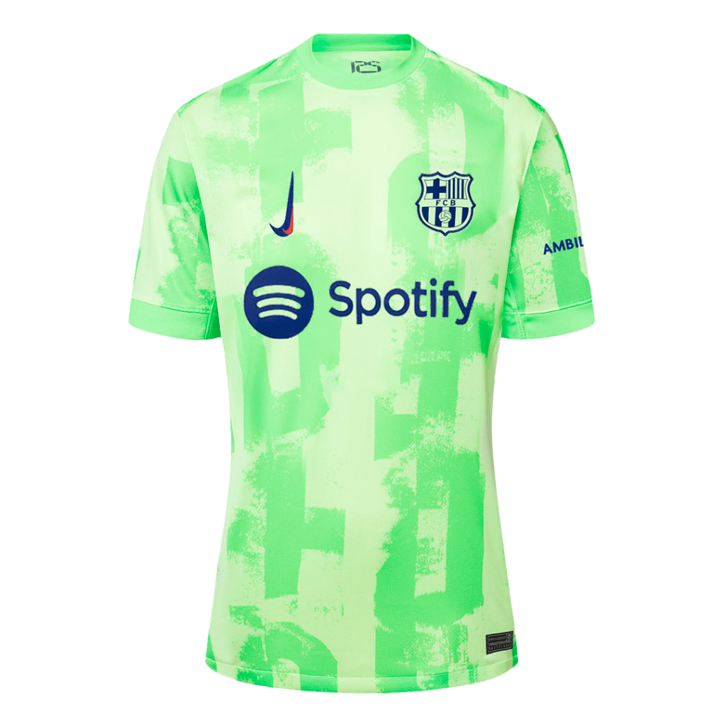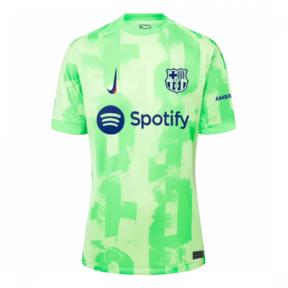 Step onto the pitch with the Barcelona Third Away Soccer Jersey, featuring a bold neon green design accented by abstract tonal patterns that radiate modern energy. This fresh look honors the club’s daring spirit and innovative playstyle, reflecting the vibrant city and passionate fans behind every match. Perfectly crafted for comfort and performance, this jersey keeps players cool and dry throughout the game.