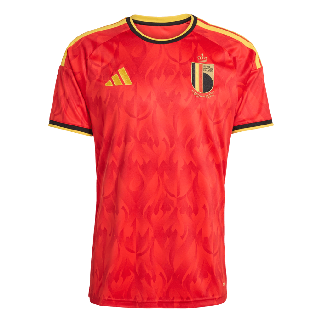 Ignite your passion for football with the Belgium Home Soccer Jersey World Cup 2026, featuring a bold red design inspired by the fiery spirit and resilience of the Belgian national team. This jersey showcases subtle flame patterns woven across the fabric, accented by striking gold details on the shoulders, badge, and trim—symbolizing the prestige and pride of the Red Devils. Built for peak performance, it combines breathable, lightweight fabric with advanced moisture-wicking technology to keep you cool and comfortable on and off the pitch.