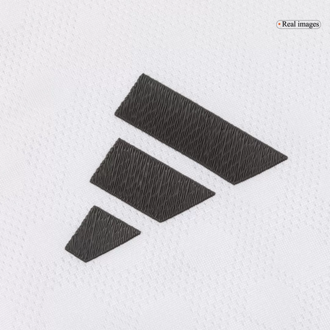Just like Bellingham’s playstyle, this jersey is all about energy, vision, and precision. The design features a sleek white base complemented by yellow piping, light gray applications, and black logos. The yellow line running down the sides mirrors Bellingham’s flair and the versatility he brings to the midfield. The subtle gray striping along the cuffs and collar, as well as the light gray side panel, highlight the attention to detail and class that Real Madrid represents.
