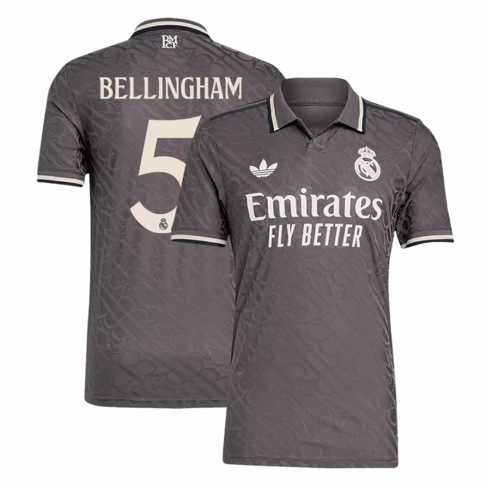 Step onto the pitch with the BELLINGHAM #5 Real Madrid Third Away Authentic Soccer Jersey, a sleek tribute to one of the world’s most legendary clubs. Featuring a sophisticated charcoal gray base adorned with subtle, intricate patterns and refined cream accents on the collar, sleeves, and lettering, this jersey captures the spirit of Real Madrid’s relentless pursuit of excellence. The classic polo collar adds a touch of timeless elegance to this modern design, echoing the club’s rich history of prestige and victory.