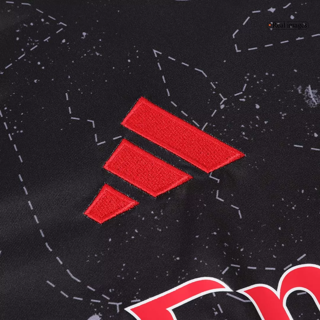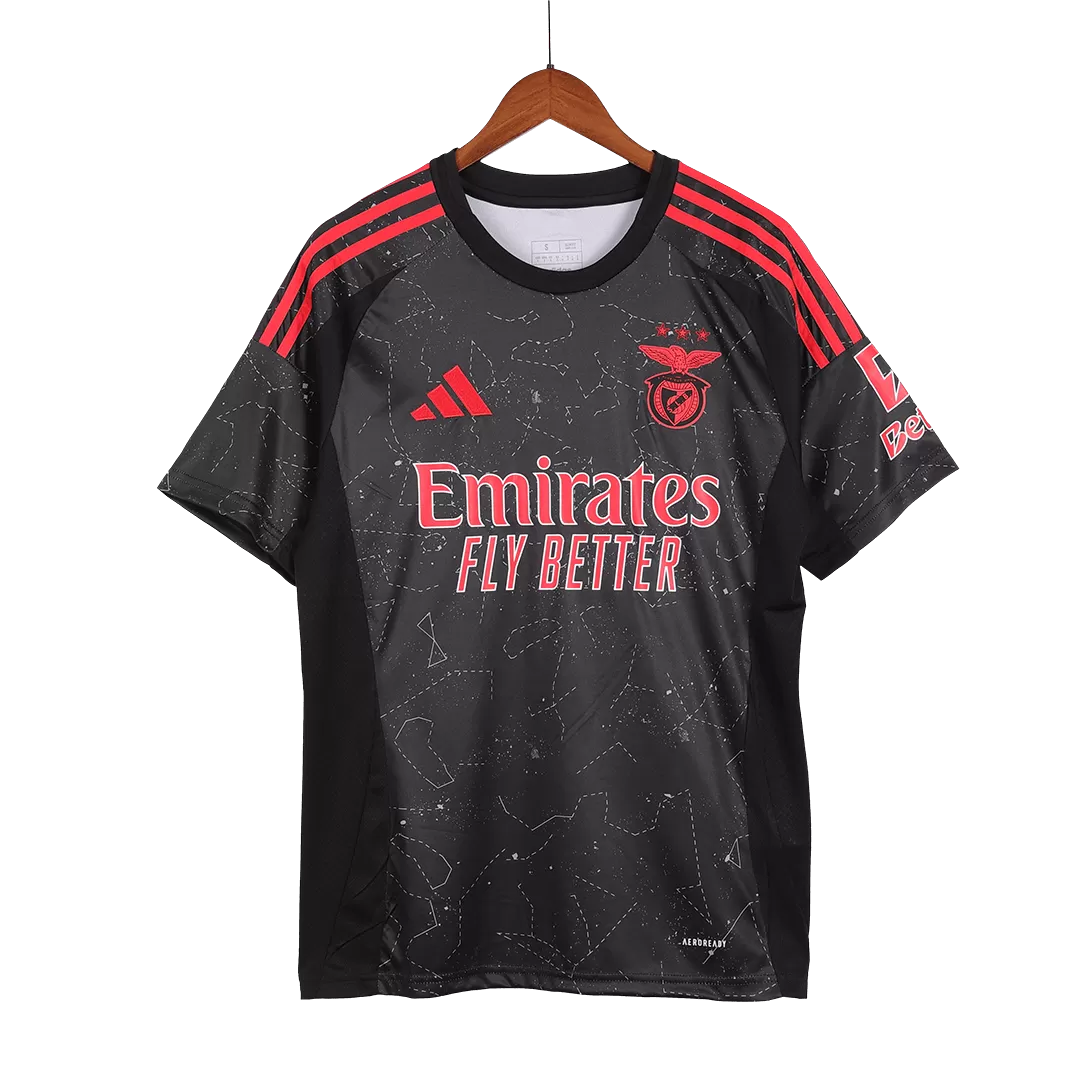 The cheap 2024-2025 Benfica jersey, worn by Sport Lisboa e Benfica, is a sleek black design featuring a star-inspired pattern with vivid red accents adorning the shoulders and sleeves. Paying homage to the alignment of stars on February 28, 1904, this new Benfica jersey symbolizes the historic night that marked the club’s inception and the beginning of its illustrious Benfica journey. The striking red three stripes, logo, and Benfica crest further highlight this tribute to all dedicated Benfica supporters, honoring their unwavering presence and support no matter where they may be.