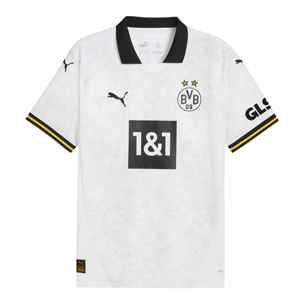 Step onto the pitch with the Borussia Dortmund Third Away Soccer Jersey, a sleek tribute to the club’s winning spirit. Featuring a crisp white base with subtle marbled patterns, this jersey is accented by sharp black details on the collar and sleeve cuffs, highlighted with the team’s signature yellow stripes. It captures the relentless energy and bold identity of BVB, honoring a legacy built on passion and precision.