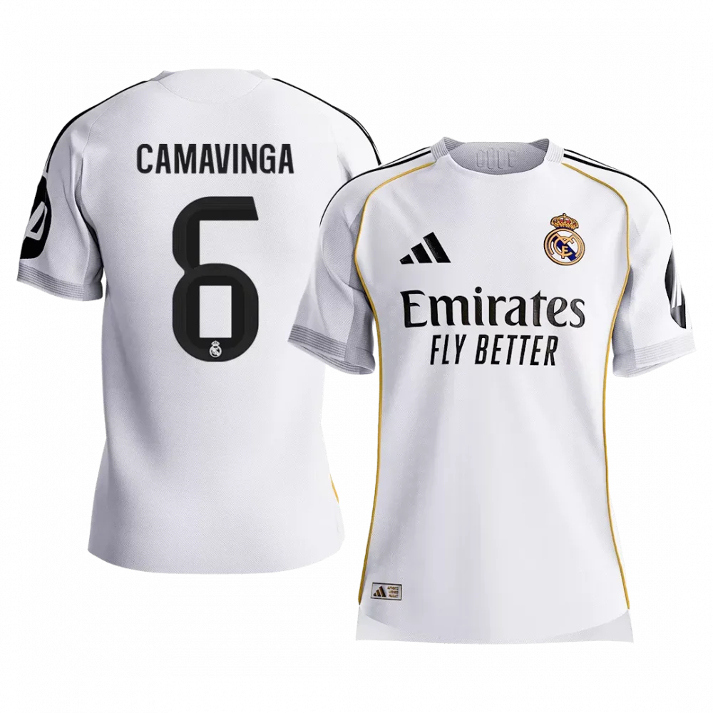 Step onto the pitch in the CAMAVINGA #6 Real Madrid Home Authentic Soccer Jersey 2025/26, where classic elegance meets cutting-edge performance. Featuring Real Madrid’s iconic white base accented with subtle gold piping and sleek black detailing, this jersey honors the club’s rich history of excellence and royal prestige. Engineered with breathable, lightweight fabric and advanced moisture-wicking features, it keeps you cool and comfortable through every intense moment.