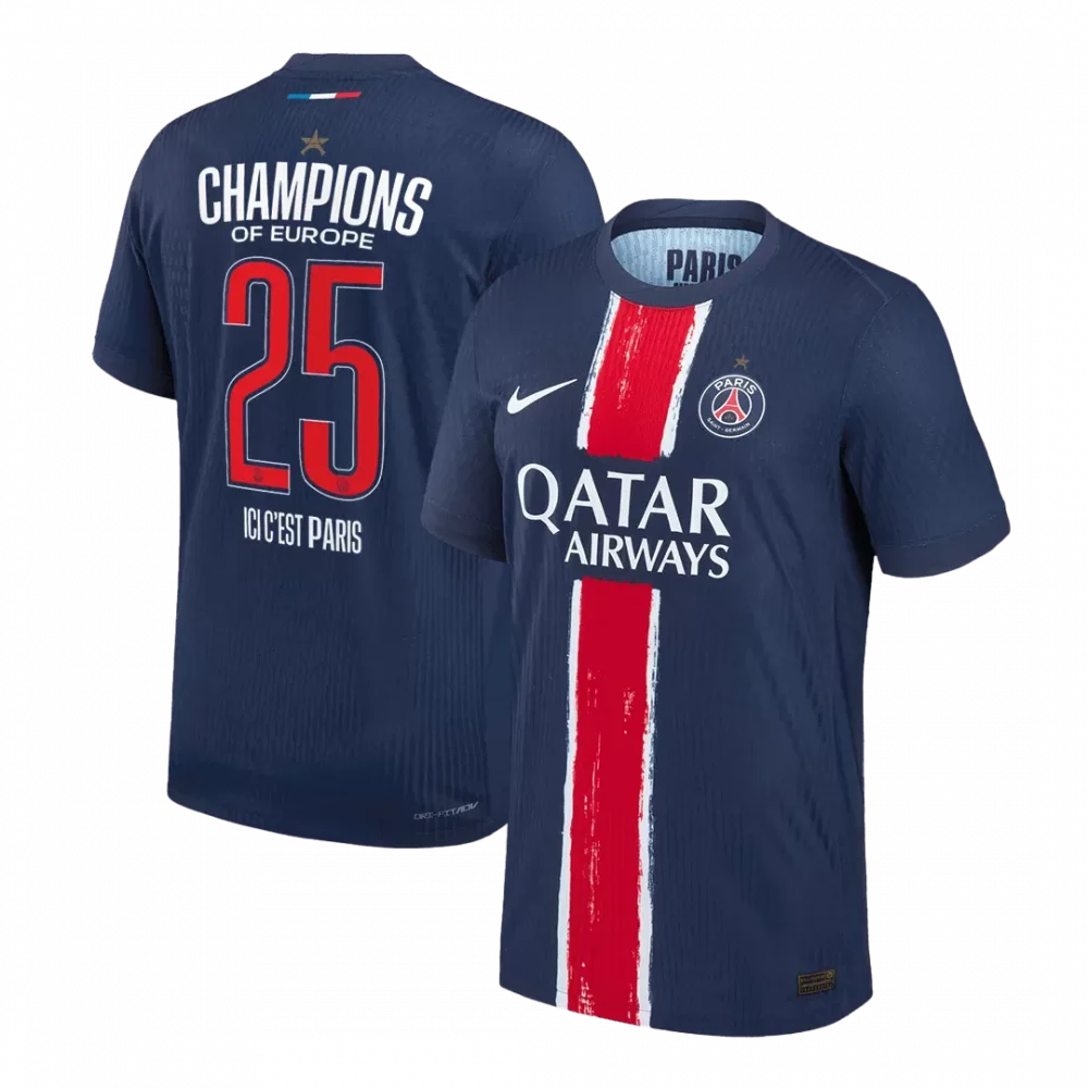 Celebrate PSG’s unstoppable spirit with the CHAMPIONS #25 Home Authentic Soccer Jersey. Featuring the iconic navy base with a bold, brushstroke red and white central stripe, this jersey honors Paris Saint-Germain’s rise as Champions of Europe. The back proudly displays “CHAMPIONS OF EUROPE” and the number 25, symbolizing a historic milestone, alongside the rallying cry “Ici c’est Paris,” reinforcing the club’s unbreakable hometown pride.