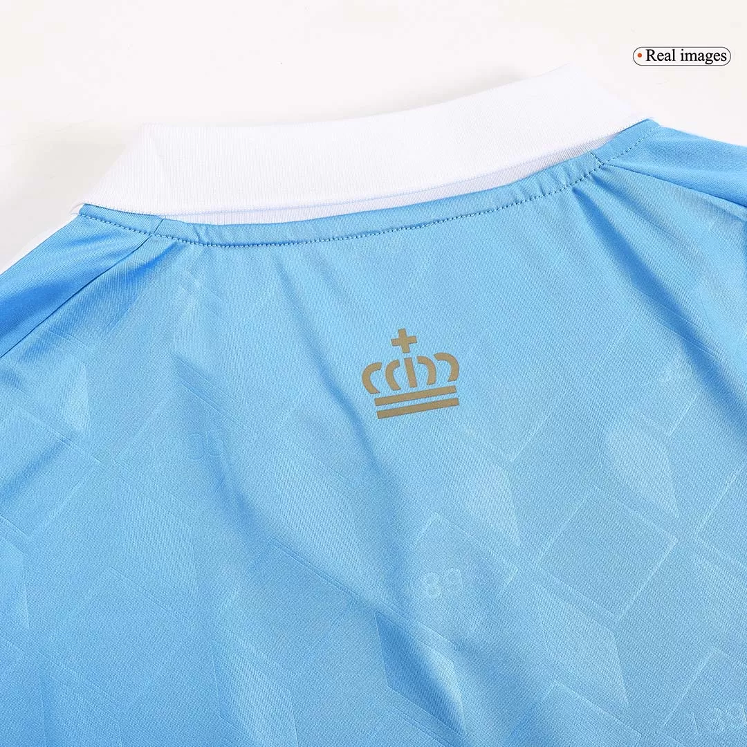 Wear this jersey with pride and make a statement wherever you go! The away soccer kit for the Belgian Red Devils features a blue jersey with characteristic white collar. This Belgium kit pays homage to Belgian cartoonist Hergé and his famous comic book character Tintin.