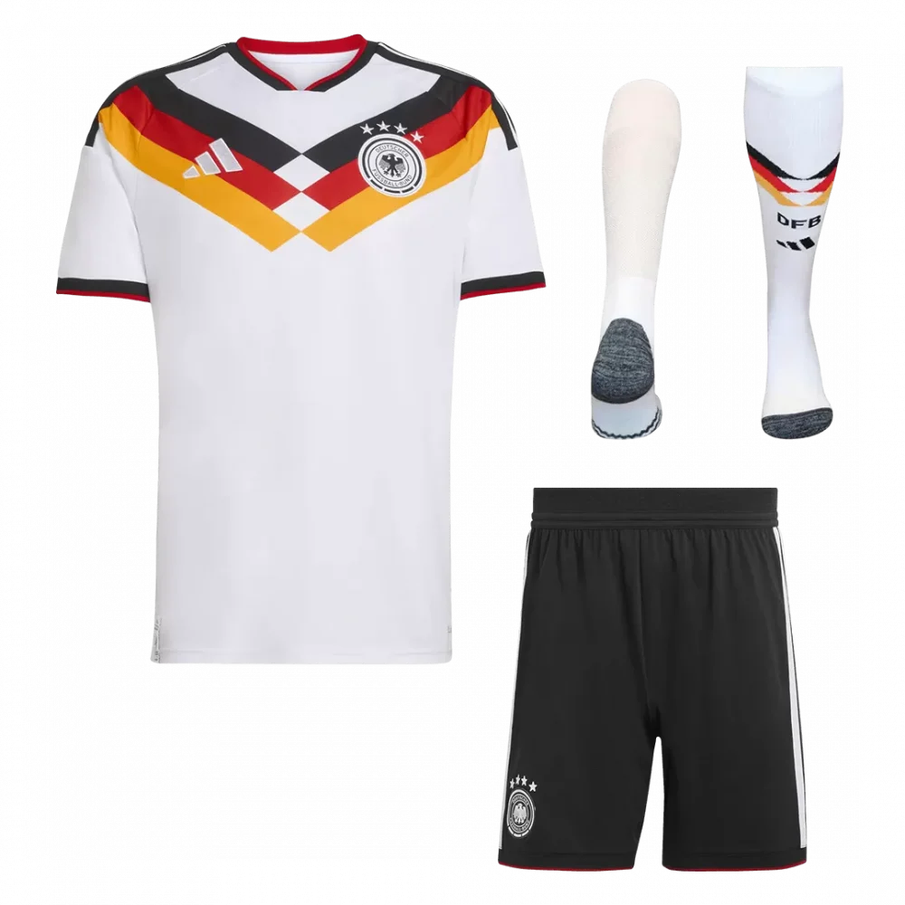Step into history and pride with the Germany Home World Cup Jerseys Full Kit 2026. Featuring a bold white base complemented by the iconic black, red, and gold chevron pattern across the chest, this design pays homage to the nation’s rich football legacy. The sharp details and clean lines embody the precision and dedication synonymous with the German team. Crafted with advanced moisture-wicking and breathable fabric, this kit guarantees comfort and performance on the pitch.