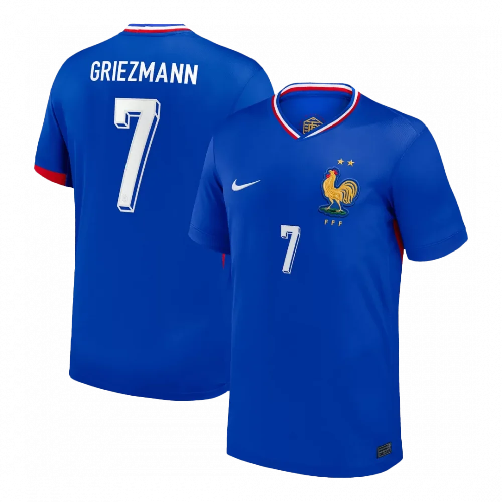 Step onto the pitch with the iconic France Home Soccer Jersey, proudly bearing Griezmann’s number 7. Featuring a bold blue base with striking red and white accents on the collar and sleeves, this jersey pays tribute to the rich heritage of Les Bleus, symbolized by the legendary golden rooster crest. Crafted for champions, its breathable, lightweight fabric and advanced moisture-wicking design keep you comfortable and dry from kickoff to final whistle.