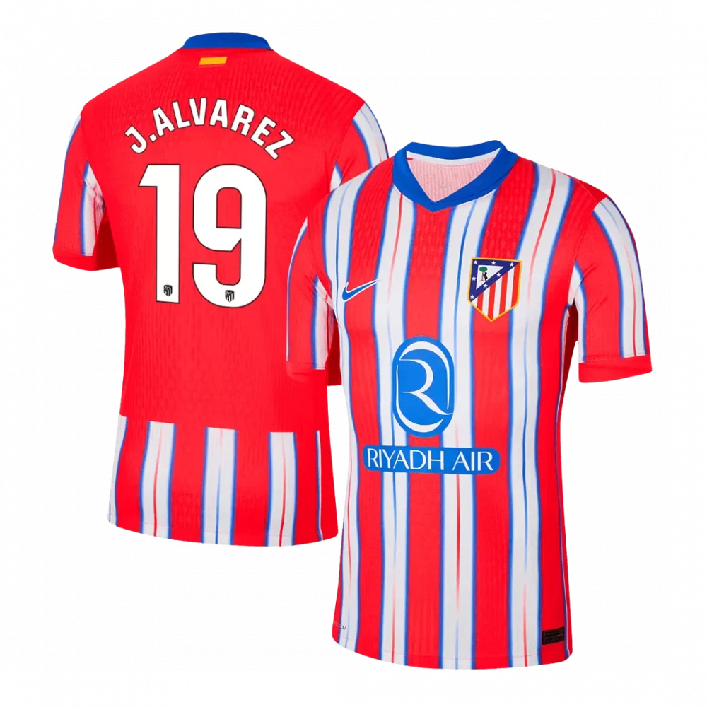 Step onto the pitch with the J.ALVAREZ #19 Atletico Madrid Home Player Version Jersey, a bold tribute to the club’s rich heritage and fierce spirit. Featuring the iconic red and white vertical stripes with dynamic blue accents, this jersey captures the energy and pride of Atletico Madrid. The contrasting blue collar adds a sharp, modern touch to the classic design, symbolizing the team’s relentless drive and unity.