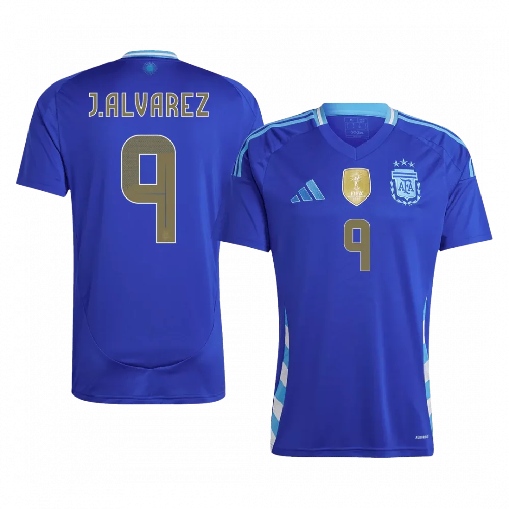Step into the spirit of Argentina with the J.ALVAREZ #9 Away Soccer Jersey, showcasing a bold royal blue base accented by sky blue stripes and subtle gold details that honor the nation’s proud football heritage. This jersey captures the essence of Argentina’s relentless passion and skill on the international stage, designed for those who play and cheer with heart. Crafted with breathable, lightweight fabric and advanced moisture-wicking technology, it keeps you cool and comfortable from kickoff to the final whistle.