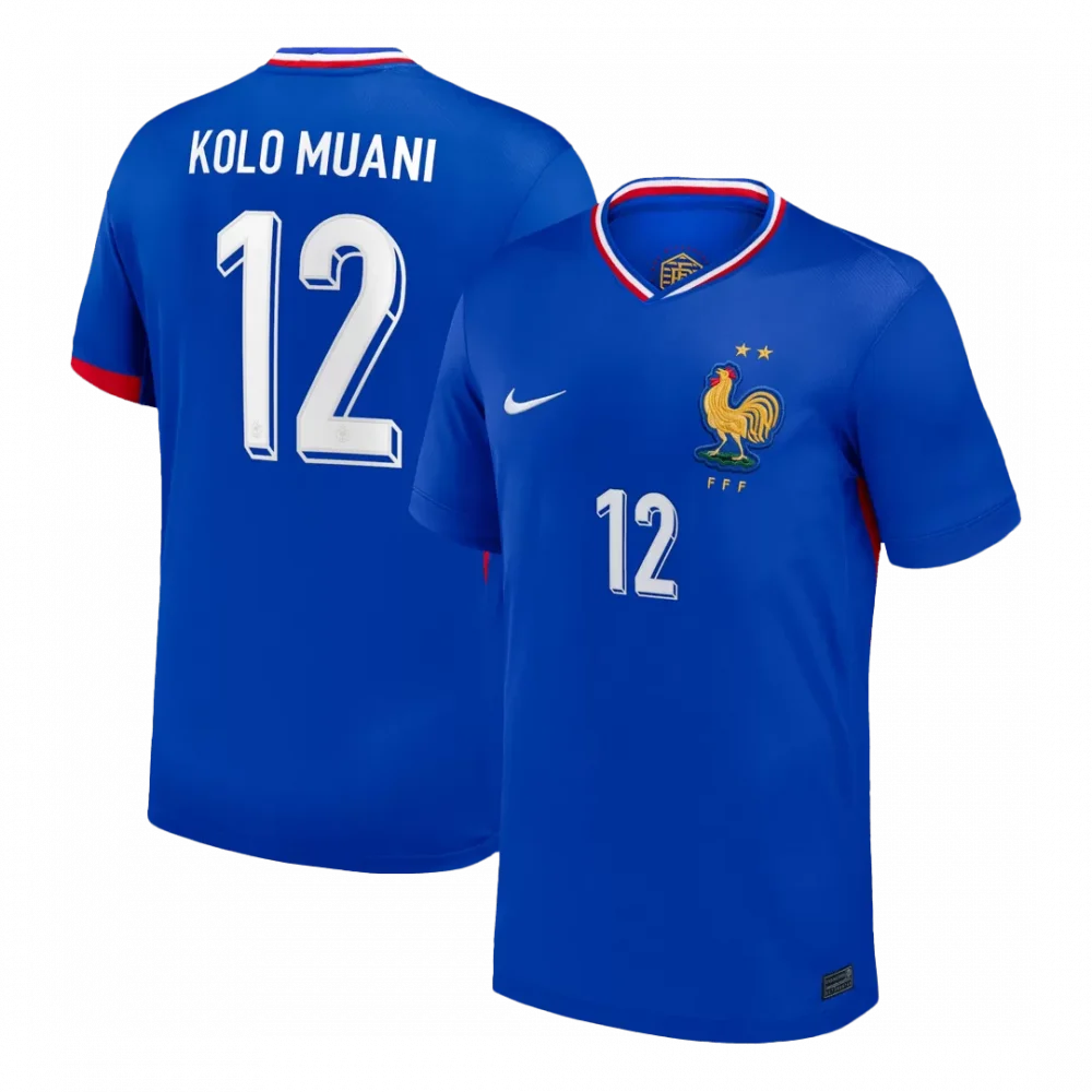Step onto the pitch with the KOLO MUANI #12 France Home Soccer Jersey, a tribute to the timeless blue that defines Les Bleus. This sleek design features vibrant royal blue with subtle texturing, complemented by red and white accents on the collar and sleeves, reflecting the French national pride and rich football heritage. Wear the iconic golden rooster emblem with two stars proudly, symbolizing France’s legacy of excellence.