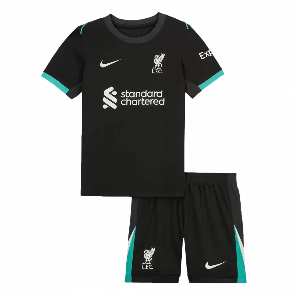 Step into the spirit of the Reds with the Liverpool Away Kids Soccer Jerseys Kit, featuring a sleek black base accented by vibrant teal highlights on the sleeves and shorts. This bold, modern design echoes Liverpool’s fearless approach and rich football heritage, perfect for young fans ready to embrace the club’s relentless energy. Crafted with breathable, lightweight fabric and advanced moisture-wicking to keep kids cool and comfortable on the pitch.