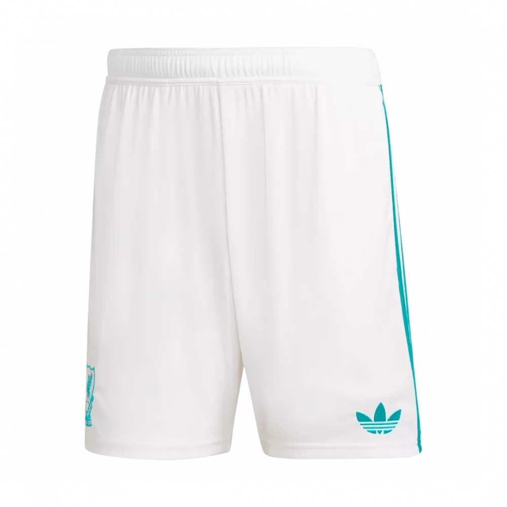 Step onto the pitch with the Liverpool Third Away Soccer Shorts 2025/26, showcasing a clean white base accented by vibrant teal stripes and detailing that pay tribute to the club’s rich history of bold and dynamic play. These shorts embody the spirit of Liverpool’s relentless pursuit of excellence, blending classic design with modern performance features.