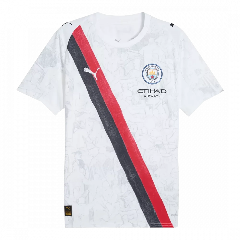 Celebrate Manchester City’s global rise with the KidSuper Soccer Jersey 2025/26 – Club World Cup edition. Featuring a striking diagonal red and black stripe across a crisp white canvas, this jersey pays tribute to the club’s vibrant spirit and ambition on the world stage, while subtle graphic details tell the story of its passionate fanbase. Perfect for young supporters who want to wear their pride in style and comfort.