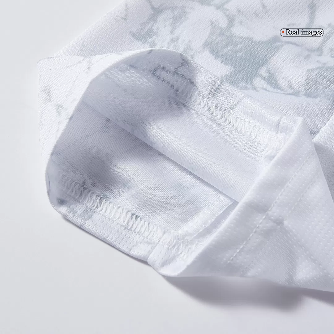 Predominantly white, the kit showcases a bold black-and-red sash that recalls the classic 2009–11 third shirt. What makes this Manchester City soccer jersey even more special is the Poznań-inspired pattern—fans linking arms with their backs to the pitch, celebrating City in their own unique way. Available as an Manchester City authentic jersey or a premium replica jersey, it’s the perfect fan jersey for collectors and supporters alike.