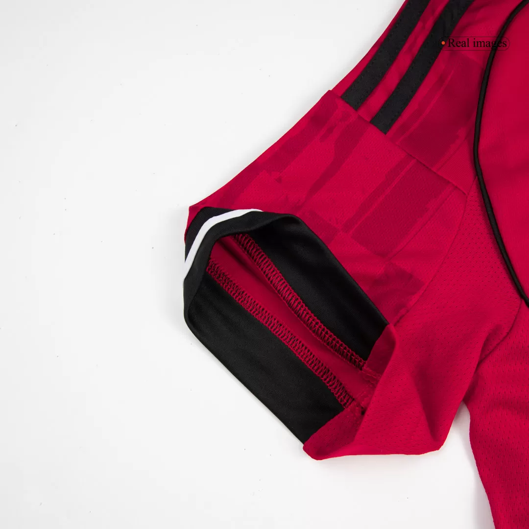 Crafted for true Red Devils, this Manchester United jersey combines modern performance with heritage styling. The jersey is predominantly red, detailed with white logos and a sharp black collar and cuffs with white trim. Most notably, the abstract red sleeve pattern draws direct inspiration from the architecture of Old Trafford – a bold choice not seen since the club’s 1996-98 bespoke sleeve design.