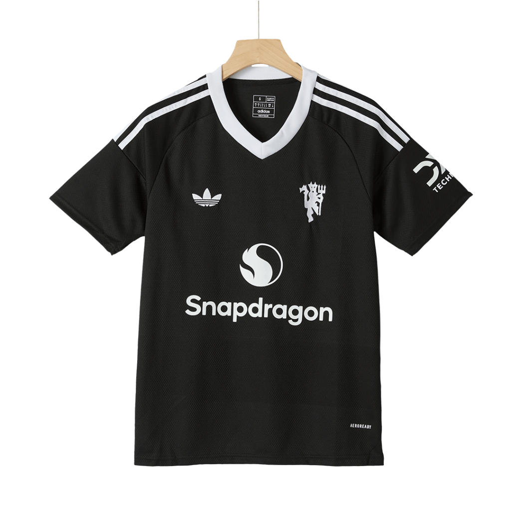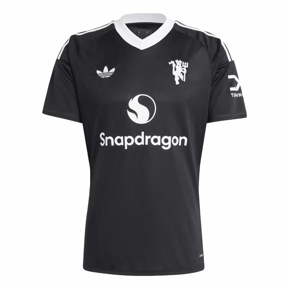 Step into the net with confidence wearing the Manchester United Third Away Goalkeeper Jersey in sleek black. This striking design channels a bold, modern look while paying homage to the club’s rich history with the classic devil crest in crisp white, symbolizing strength and resilience. Crafted for goalkeepers who demand peak performance, this jersey combines breathable, moisture-wicking fabric with a lightweight feel to keep you comfortable and agile throughout every match.
