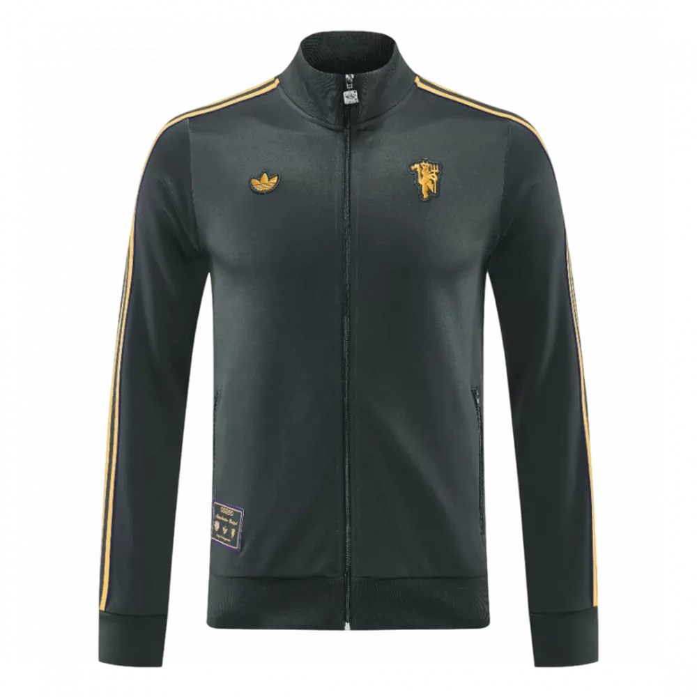 Step out in style with the Manchester United Track Jacket 2025/26 in sleek black, highlighted by gold accents along the shoulders and sleeves that pay tribute to the club’s rich heritage and enduring spirit. The minimalist yet bold design features the iconic crest and details that echo decades of passion and triumph at Old Trafford. Crafted from lightweight, breathable fabric with advanced moisture-wicking properties, this jacket ensures comfort whether you’re on the move or supporting from the stands.