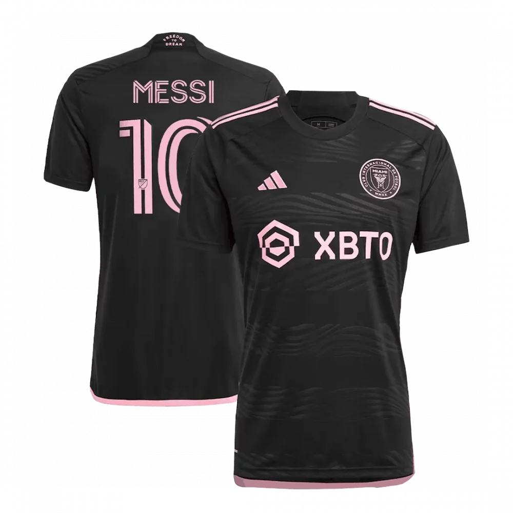 Step into the spirit of South Florida with the MESSI #10 Inter Miami CF Away Jersey 2023. This sleek black jersey is highlighted by soft pink accents on the stripes, collar, and trim, reflecting the club’s bold identity and vibrant Miami culture. Subtle wave patterns across the fabric evoke the dynamic energy of the coast, making it a standout piece for any fan.