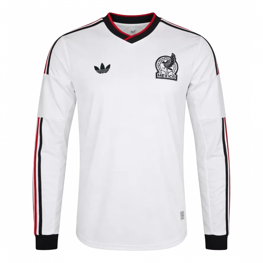 Step onto the pitch with the Mexico Away Long Sleeve Jersey World Cup 2026, where classic elegance meets fierce national pride. This sleek white jersey features bold black and red striping along the sleeves and a striking V-neck collar, inspired by Mexico’s rich football heritage and its legendary Aztec eagle emblem. Designed to keep you comfortable and focused, it combines advanced moisture-wicking and breathable fabric for ultimate performance during every match.