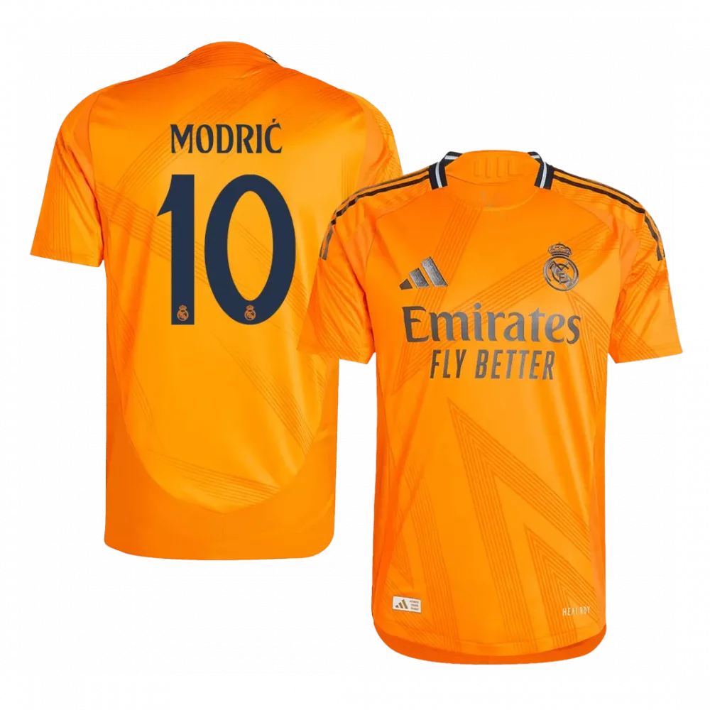 Step into the passion and legacy of Real Madrid with the MODRIĆ #10 Away Authentic Soccer Jersey. Featuring a vibrant orange base with subtle geometric patterns and contrasting dark details, this jersey captures the bold spirit of the team’s away battles, paying homage to the club’s relentless drive for victory. Crafted for peak performance, it keeps you cool and comfortable whether on the pitch or cheering from the stands.