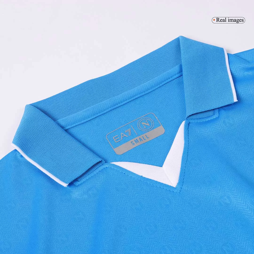 After revealing a fresh logo and brand image, Napoli has launched their 24-25 home kit, exuding a sophisticated and polished aesthetic. The new SSC Napoli home jersey, predominantly blue in hue, features accents of the Italian flag adorning the neckline and sleeves, adding a patriotic touch to the design. Complementing this, white lines embellish the shoulders, enhancing the overall sleek appearance of the Napoli jersey. To elevate the visual appeal of the EA7 Napoli jersey 24-25, the EA7 logo and Napoli Crest are intricately embossed in 3D, introducing depth and dimension to the garment’s design.