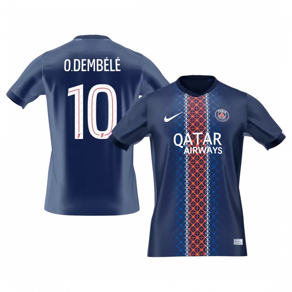 Step into the heart of Paris football with the O.Dembélé #10 PSG Home Soccer Jersey 2025/26. Featuring a deep navy base accented by a striking vertical pattern in red and white, this jersey pays tribute to PSG’s iconic colors and rich heritage of passion and precision. Designed to keep you comfortable and agile, it blends advanced moisture-wicking and breathable fabric with a lightweight fit for unmatched performance on and off the pitch.