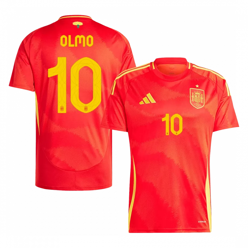Ignite your passion for La Roja with the OLMO #10 Spain Home Soccer Jersey EURO. Featuring Spain’s iconic vibrant red with bold yellow accents, this jersey celebrates the nation’s rich football heritage and relentless spirit on the pitch. The subtle pattern across the fabric adds dynamic depth while the classic crest and star symbolize Spain’s championship glory.