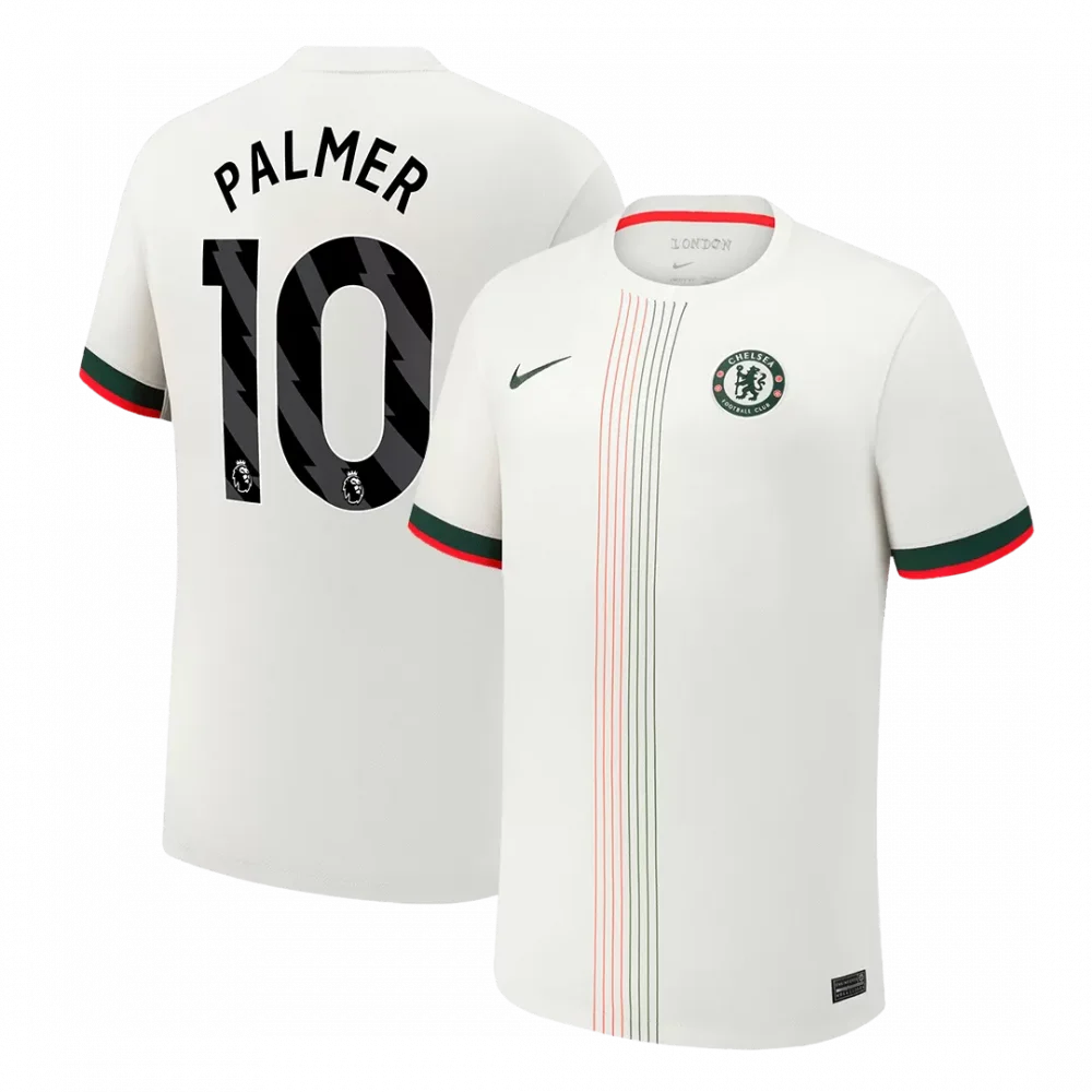 Step out in style with the PALMER #10 Chelsea Away Soccer Jersey 2025/26, where classic white meets subtle green and red accents for a fresh, modern look. The thin vertical stripes on the front pay homage to Chelsea’s rich heritage, balancing tradition with contemporary flair. Crafted for the dedicated fan, this lightweight jersey offers breathability and advanced moisture-wicking to keep you comfortable whether on the pitch or in the stands.