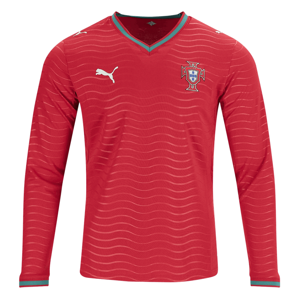 Step into the heart of Portuguese pride with the Portugal Home Long Sleeve Player Version Jersey for World Cup 2026. Featuring a vibrant red base adorned with subtle wave patterns symbolizing the nation’s deep connection to the sea, this jersey blends tradition and modernity. The classic green and red trims nod to Portugal’s rich history, empowering players to take on the world with passion and strength.