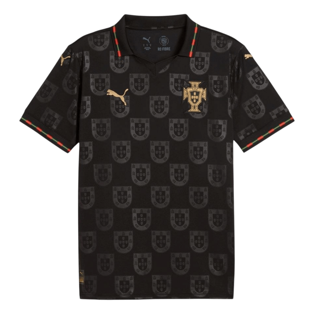Step into the future of Portuguese football with the Portugal World Cup Jerseys Kit 2026. Featuring a sleek black base adorned with a subtle, all-over crest pattern, this kit honors the nation’s rich soccer heritage with a modern twist. Accents of red and green on the collar and sleeves pay homage to Portugal’s flag, adding vibrant detail to this elegant design.