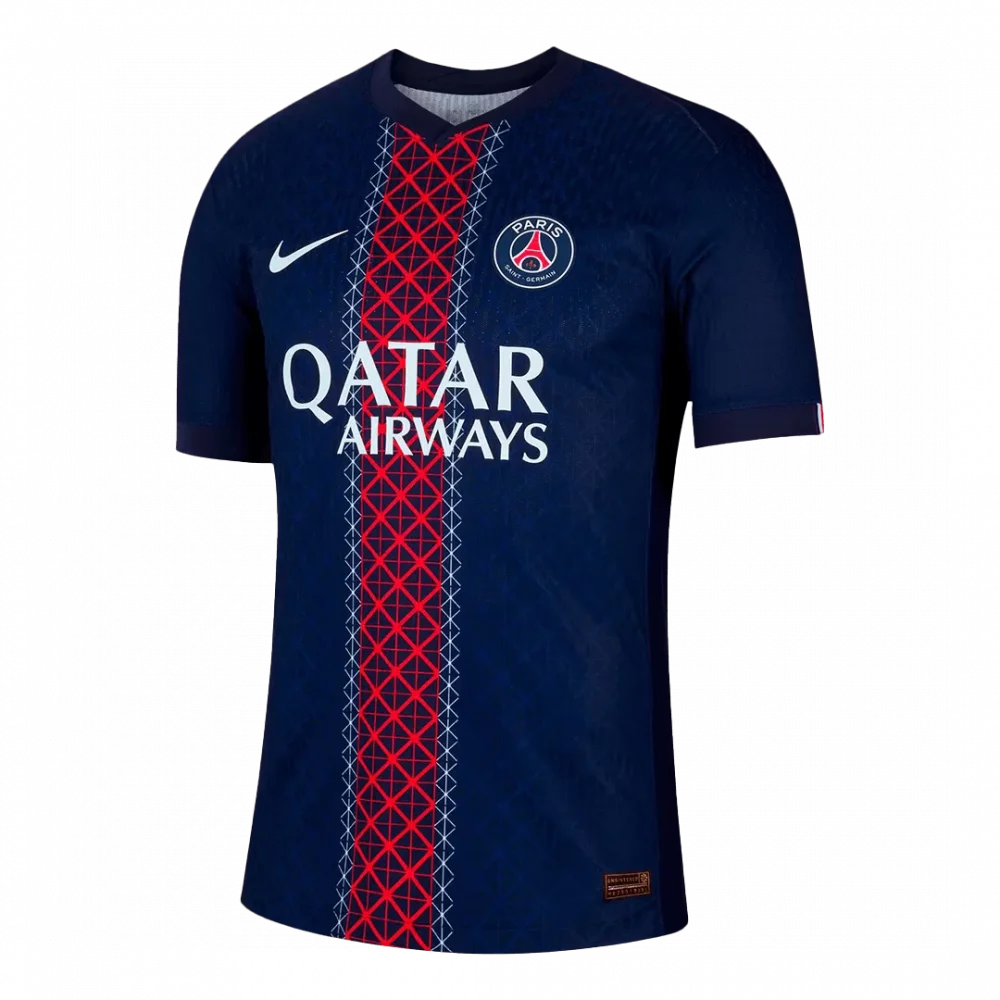 Celebrate Paris Saint-Germain’s legacy with the 2025/26 Home Authentic Soccer Jersey, designed to honor the club’s relentless pursuit of global glory. Featuring the classic navy blue base, a bold red central stripe accented by dynamic geometric patterns, this jersey captures the spirit of both tradition and innovation. Lightweight and breathable, it’s crafted to keep you comfortable from kickoff to final whistle.