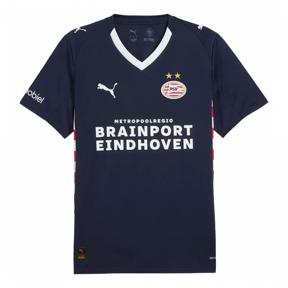 Step onto the pitch with the striking PSV Eindhoven Away Soccer Jersey 2025/26, featuring a sleek navy blue design accented by a bold white V-neck collar and signature red-and-white side stripes that pay homage to the club’s rich heritage. This jersey embodies the spirit of PSV’s relentless drive and proud history, perfect for fans who wear their passion with pride. Crafted from lightweight, breathable fabric, it ensures peak comfort and advanced moisture-wicking to keep you cool and focused during every match.