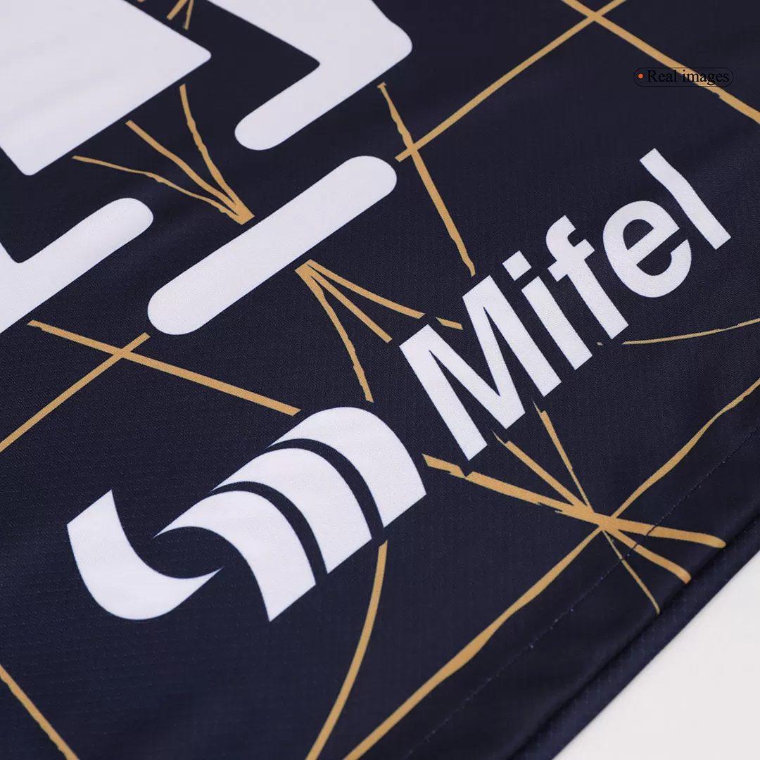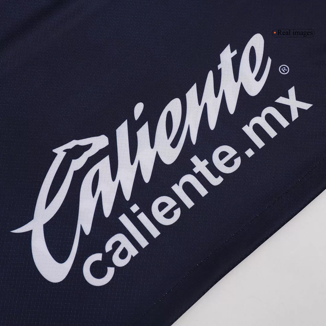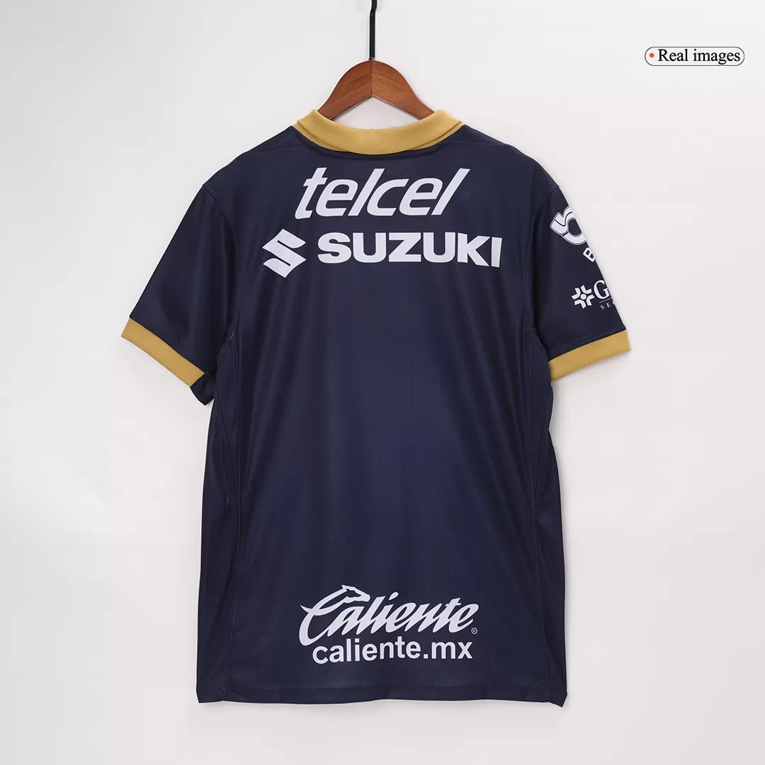 Drawing inspiration from their Pumas UNAM jersey from the late 90s and the club’s unique crest for the away respectively, the new Pumas UNAM jersey 24-25 away football shirt still has the main navy color with a large white Pumas crest on the front of Pumas UNAM jersey. The collar and cuffs are both gold, giving a classic feel. The inspiration behind this design is the origin of the Puma head logo itself; it sits upon a geometric pattern in gold, nodding to the fact the crest recently celebrated its 50th anniversary by acknowledging the original sketches of its preconception.