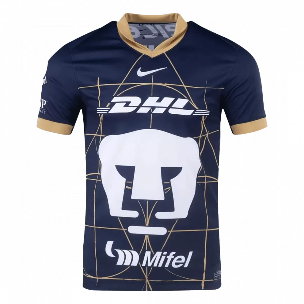 Step into the passion and pride of Pumas UNAM with this striking Away Soccer Jersey. Featuring a deep navy base adorned with gold geometric lines and accents, this jersey pays homage to the club’s iconic heritage and its emblematic puma crest at the center. Designed to keep you comfortable on and off the pitch, it blends a lightweight, breathable fabric with advanced moisture-wicking properties to help you stay cool and focused.