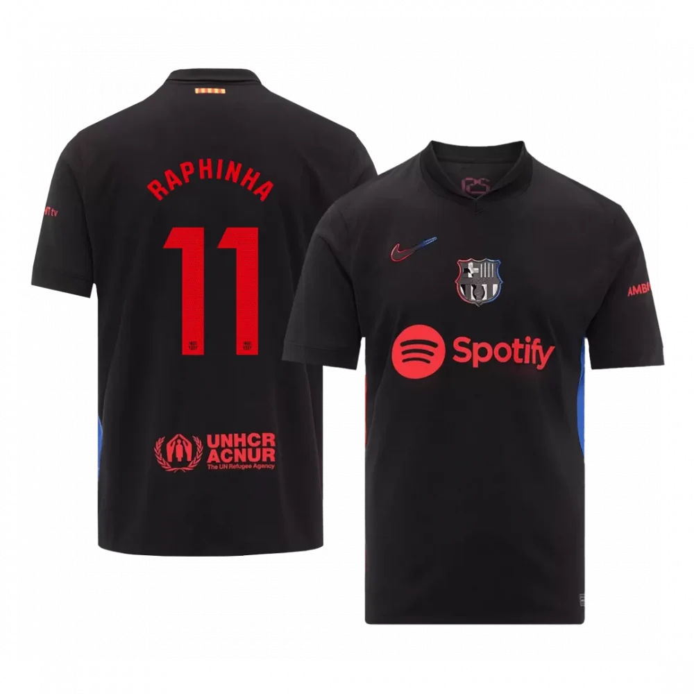Step into the spirit of Catalonia with the RAPHINHA #11 Barcelona Away Soccer Jersey, a sleek black kit accented by bold red lettering and vibrant hints of classic Blaugrana blue. This striking design pays homage to one of football’s most iconic clubs, blending tradition with a modern, fearless look that captures the team’s commitment to excellence and innovation on the pitch.