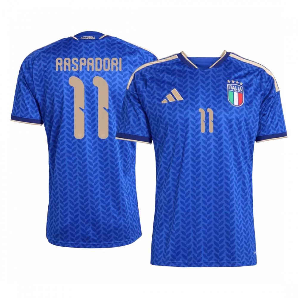 Step into the legacy of Italian football with the RASPADORI #11 Italy Home Soccer Jersey for the 2026 World Cup. This striking blue jersey is adorned with a subtle yet dynamic pattern inspired by Italy’s rich cultural heritage, enhanced with elegant gold accents on the shoulders and trims that symbolize the Azzurri’s prestige and four-star World Cup triumphs. Represent the spirit of one of football’s most storied nations with unmatched style and comfort.