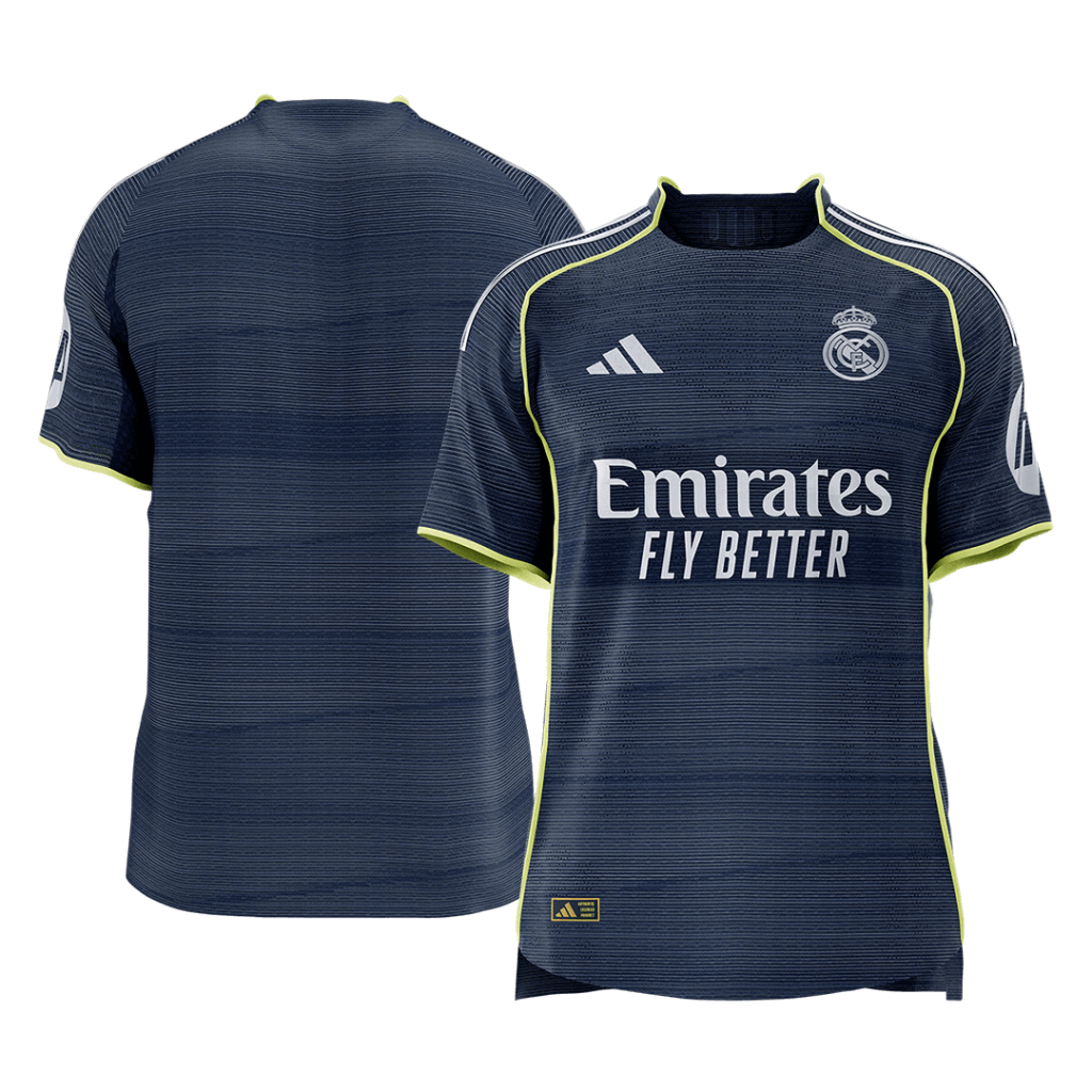 Step out with the Real Madrid Away Authentic Soccer Jersey 2025/26, where tradition meets modern edge. Draped in a deep navy tone with subtle horizontal striping and sharp neon accents along the seams, this jersey captures the essence of the Spanish giants’ relentless spirit and winning legacy. Engineered for peak performance, it combines breathable, lightweight fabric and advanced moisture-wicking technology to keep you cool and dry through every challenge.