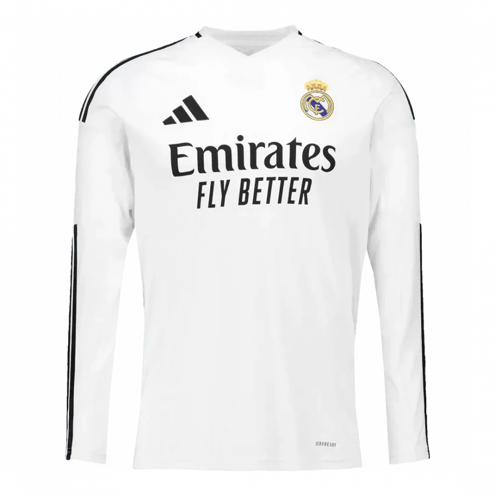Step onto the pitch in the iconic Real Madrid Home Long Sleeve Jersey, where tradition meets performance. Featuring the classic all-white design accented with bold black details and the legendary club crest, this jersey honors the rich history of Los Blancos—symbols of elegance and unparalleled success. Crafted with breathable, lightweight fabric and advanced moisture-wicking technology, it ensures you stay cool and comfortable through every moment of the game.