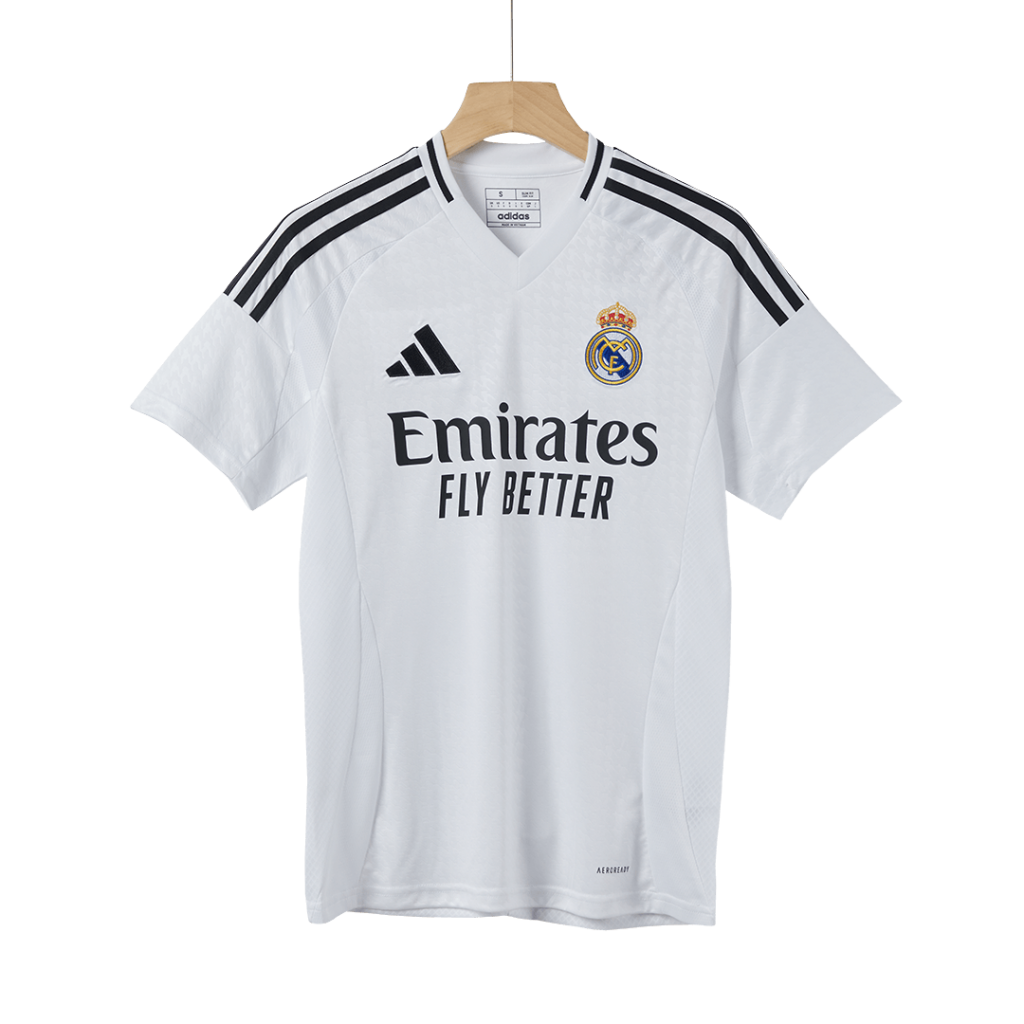 The Real Madrid Home Soccer Jersey celebrates the legendary Blanco tradition with its clean white base accented by sleek black stripes on the shoulders, embodying the club’s timeless elegance and winning spirit. Honoring decades of success, this jersey keeps you cool and confident on the pitch with breathable, moisture-wicking fabric and a lightweight, athletic fit designed for peak performance.