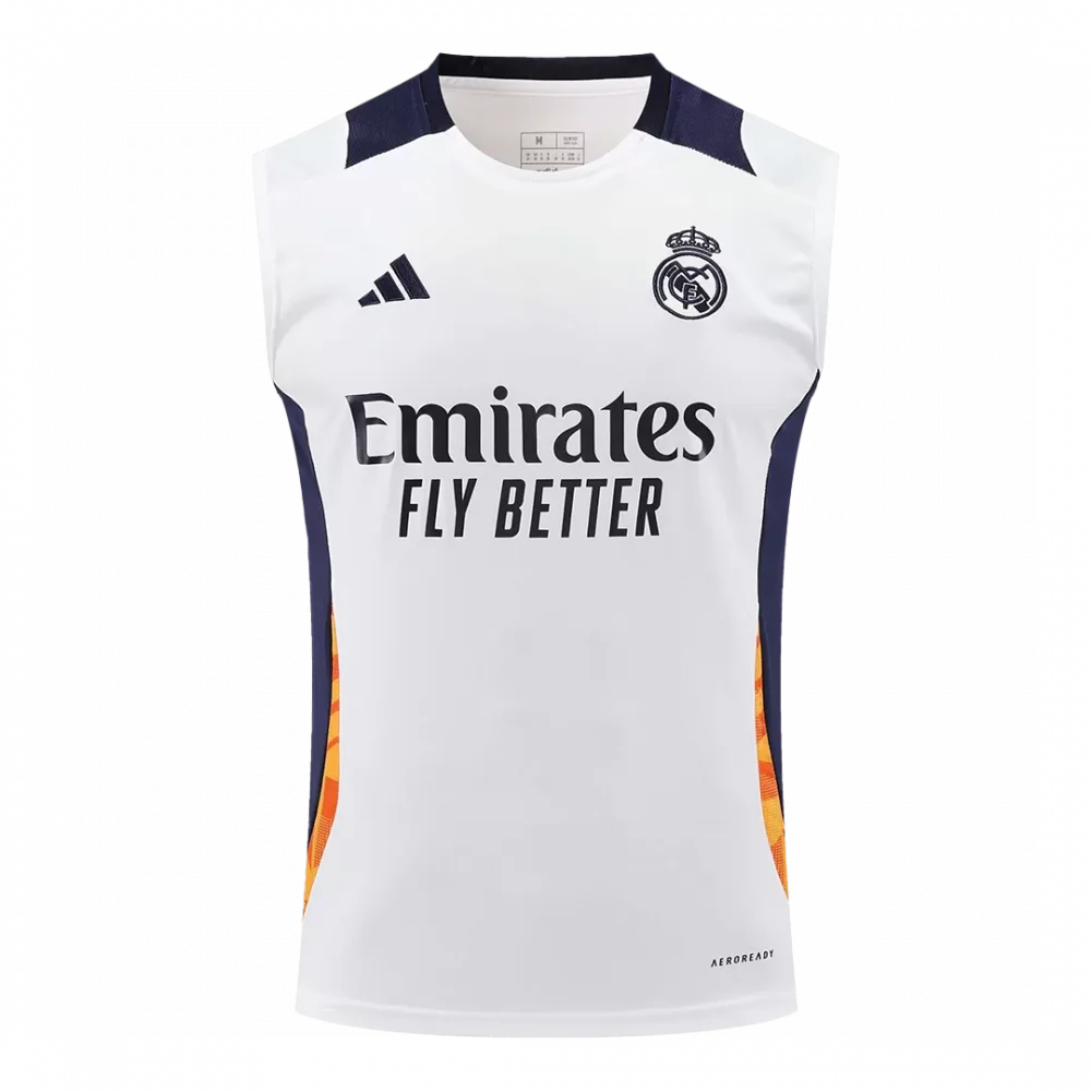 Step into the legacy of one of football’s most iconic teams with the Real Madrid Pre-Match Sleeveless Top in crisp white. Featuring classic navy accents on the shoulders and sides with subtle orange detailing, this design reflects the club’s timeless elegance and relentless spirit on and off the pitch. Ideal for warming up or casual wear, it honors the tradition of Los Blancos while boosting your performance with advanced breathable fabric.