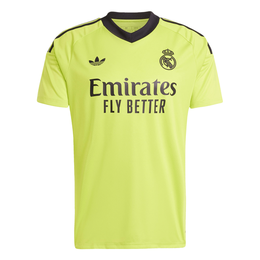 Step into the goal with confidence wearing the vibrant Real Madrid Third Away Goalkeeper Soccer Jersey in striking yellow. Featuring sharp black accents along the collar and shoulders, this jersey pays homage to the club’s bold and fearless spirit on the pitch. The iconic Real Madrid crest sits proudly on the chest, symbolizing decades of glory and passion in football history.
