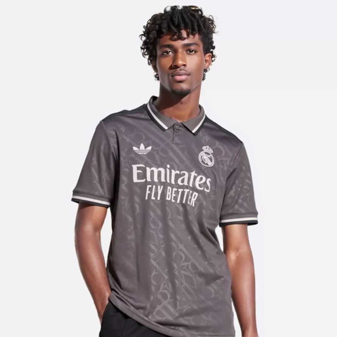 The 2024-25 Real Madrid third kit will showcase an elegant color scheme of grey, black, and white. The Real Madrid jersey will introduce a unique polo neck collar, a feature typically reserved for its Originals line. Notably, the Real Madrid shirt will incorporate a subtle yet striking detail: the ‘RMCF’ emblem from the club badge will be embossed on the fabric, creating a shimmering effect when illuminated. These embossed monograms, inspired by traditional Madrid street signage, will adorn the Real Madrid jersey, adding a touch of sophistication.