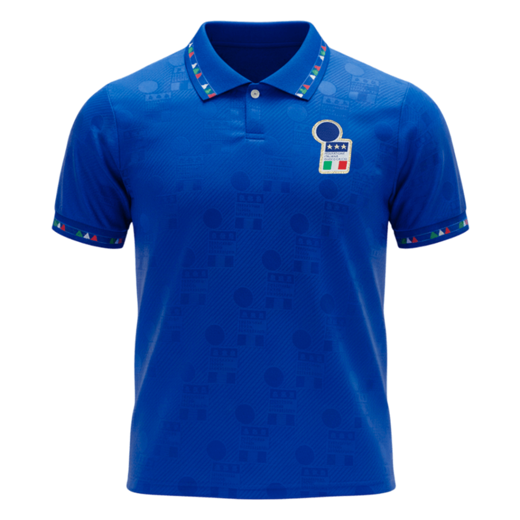 Step back into football history with the Retro Soccer Jersey Italy Home 1994, showcasing the iconic Azzurri blue with subtle geometric patterns that celebrate Italy’s rich World Cup legacy. The classic polo collar and vibrant trim highlight the Italian flag colors, perfectly capturing the pride and passion of a legendary squad. Designed for comfort and performance, this lightweight jersey features breathable, moisture-wicking fabric to keep you cool and dry on and off the pitch.